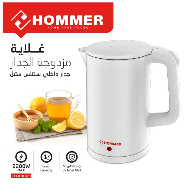 استمتع بكفاءة غلي الماء وسهولة الاستخدام مع غلاية هومر بسعة 1.7 لتر وقوة 2200 وات. تتميز هذه الغلاية بجدار داخلي من الفولاذ المقاوم للصدأ وطبقة عازلة، مع هيكل بلاستيكي يجمع بين الأناقة والمتانة. تصميم مثالي للحفاظ على درجة حرارة الماء وتوفير أداء موثوق.
