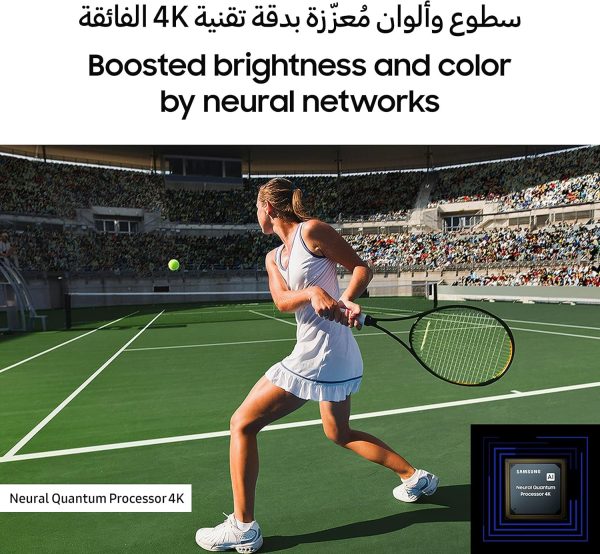 - يتميز التلفزيون بتصميم AirSlim الأنيق بسمك 26 مم، مما يجعله إضافة راقية لأي مساحة. كما يوفر معالج Quantum 4K تقنية الترقية بالذكاء الاصطناعي لتحويل المحتوى إلى دقة 4K، بينما تدعم 4 منافذ HDMI معدل تحديث 100 هرتز بدقة 4K لتجربة لعب مذهلة عبر Gaming Hub، سواء كنت تستخدم وحدة تحكم أو لا.