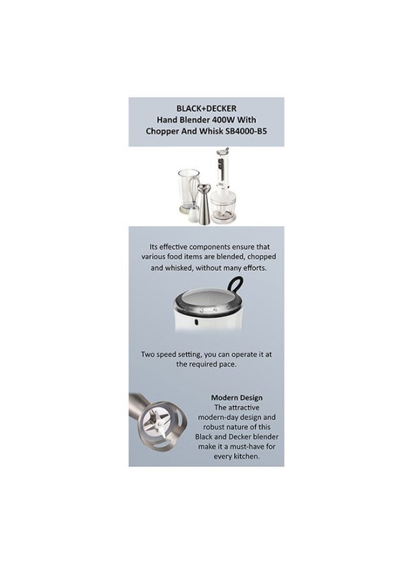 Black & Decker Hand Blender with Chopper, Bowl and Whisk, 400W, 500ml, White – SB4000-B5