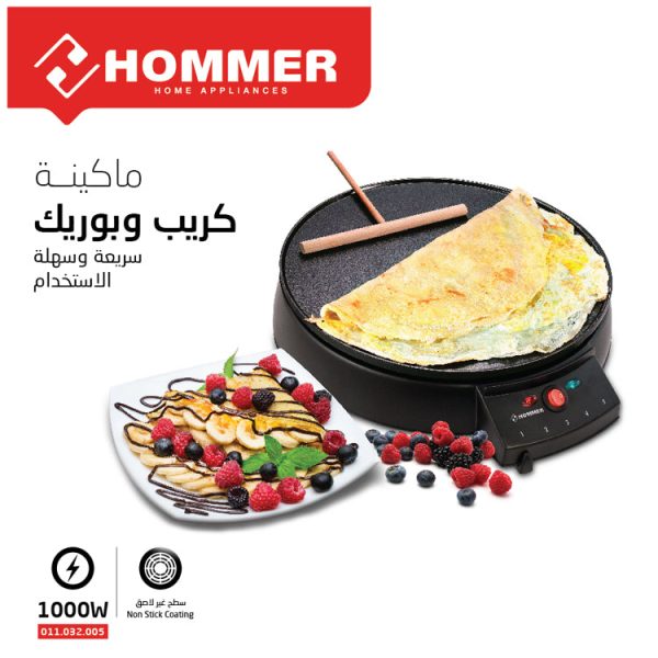 صانعة كريب وبوريك بقدرة 1000 وات وحجم 30 سم من هومر، مزودة بألواح غير لاصقة وسهلة التنظيف، مما يجعل تحضير الكريب والبوريك سريعًا وسهلًا.
