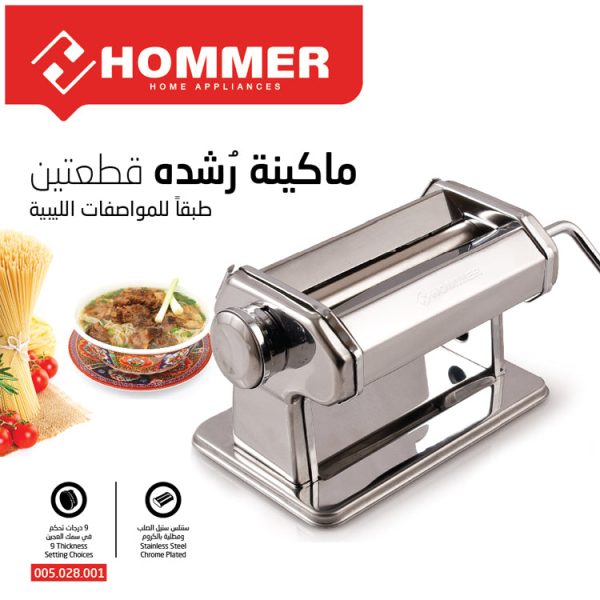 حضّر الرشتة التقليدية بكل سهولة ودقة مع ماكينة الرشتة من هومر، التي تأتي بقطعتين وتوفر لك 9 درجات للتحكم في سمك العجينة. مصممة وفقًا للمعايير الليبية، تتيح لك هذه الماكينة تحضير الرشتة بمذاق أصيل واحترافي في المنزل.