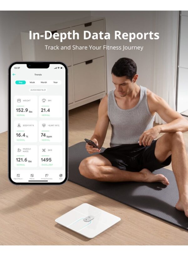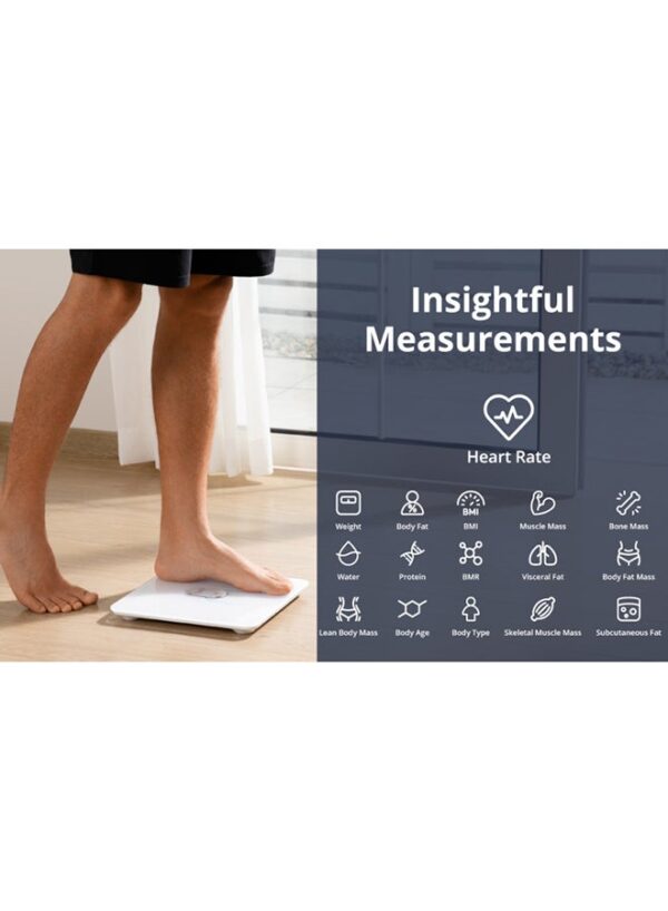• تحليل شامل لتركيب الجسم: يتتبع 16 مقياسًا صحيًا دقيقًا مثل الوزن، الدهون، الكتلة العضلية، معدل ضربات القلب، وغيرها.